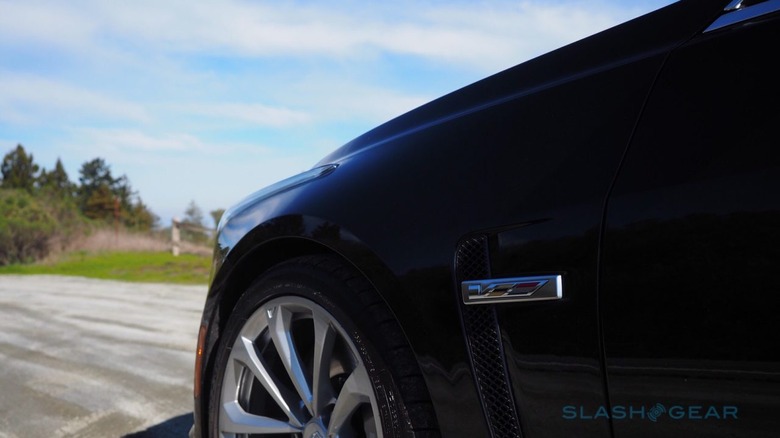 Flared arches only just fit the 19-inch lightweight forged-aluminum wheels, shod in skinny Michelin Pilot Super Sport rubber. At the rear, there's a special V-Series fascia and a surprisingly restrained spoiler; Cadillac opted not to fit the carbon-fiber package to this particular car, which adds a more aggressive front splitter, hood vent trim, rear diffuser, and a beefier spoiler, at the expense of discretion and $6,250 from your wallet.