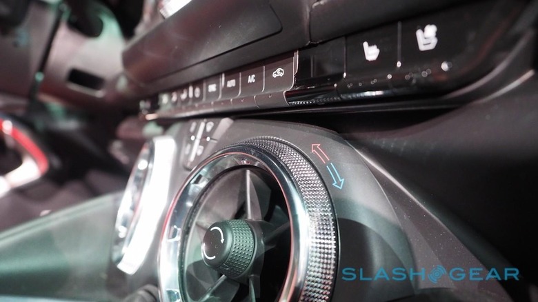 Underlining the central touchscreen is a row of buttons for controlling the heated and ventilated seats, along with most of the HVAC functions. Interestingly, Chevrolet integrated the temperature and fan controls into the knurled rings around the circular vents themselves, figuring it would both save on dashboard space and be easier to reach out and twiddle while driving.