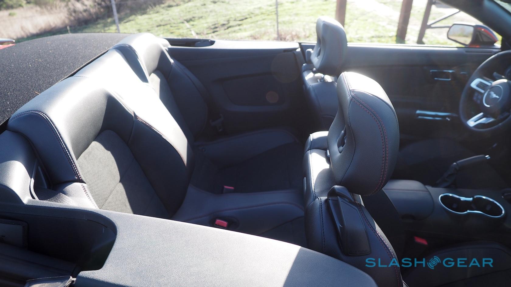 Dropping the roof is a straightforward process, though not quite one-button simple. There's a big handle to pull down and twist to unlock the fabric hood from the windshield, after which point a button sends it motoring back behind the vestigial rear seats that should probably be considered extra storage rather than suited to human occupancy. It takes about ten seconds in all.