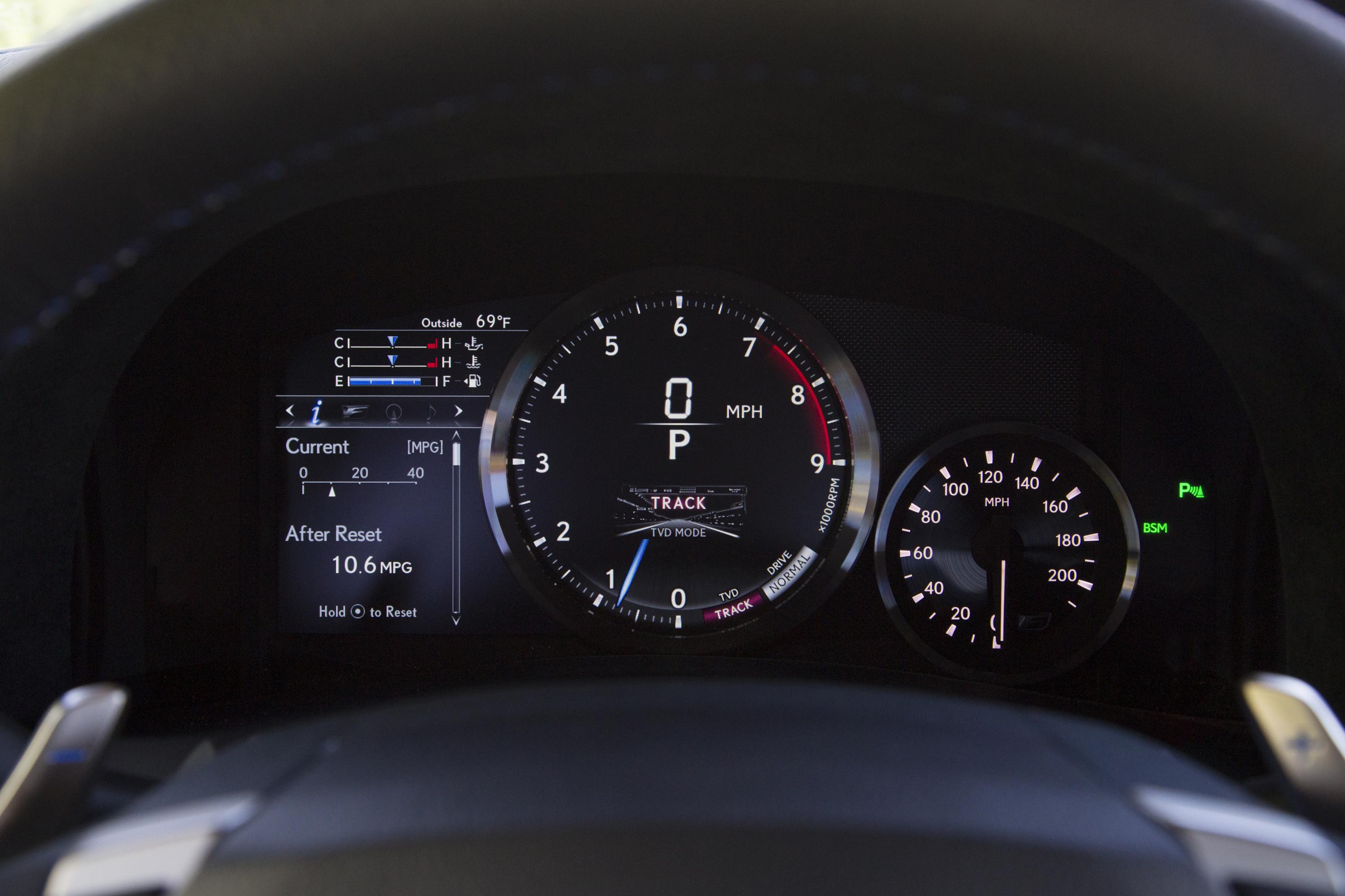 First, there are the drive modes. Eco does what most Eco modes do: taper back throttle inputs and reduce the air conditioning in the name of saving fuel. Around town, Eco is your friend. Next is Normal, the name really gives it away. A Sport mode taps into the powertrain's capabilities a little further, but it's the Sport Plus (S+) mode that makes the GS F happiest. Here, throttle is maximized—with the Active Sound Control helping you appreciate the V8 with "desirable sound notes" piped right into the cabin—and even the electric power steering is wound a little more tightly.