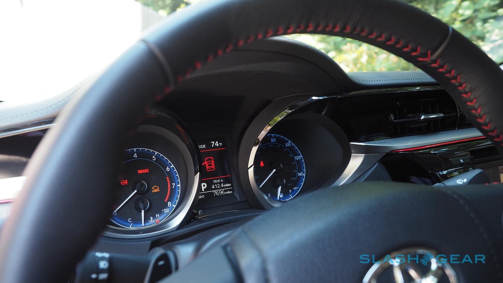 The Civic has a more salubrious interior, too, Toyota's proving heavy on black and gray plastic, a somber color scheme only emphasized by the high, cliff-like slab that is the dashboard. There's a little soft-touch plastic, and the steering wheel is leather-wrapped, but too many of the points at which your fingers naturally fall are hard and unforgiving.