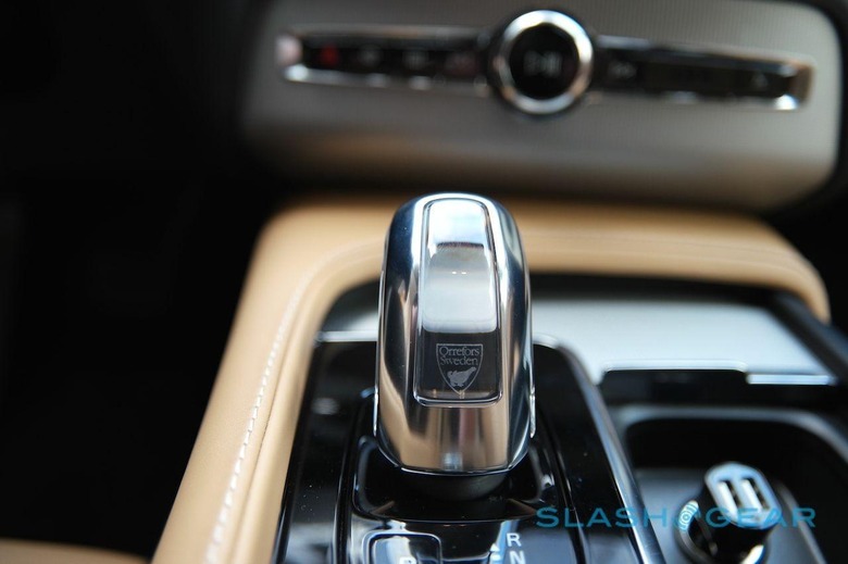 In the T8 Twin Engine, the transmission knob is a chunk of Orrefors crystal, the Swedish-made glass cradled in a bracket of aluminum.