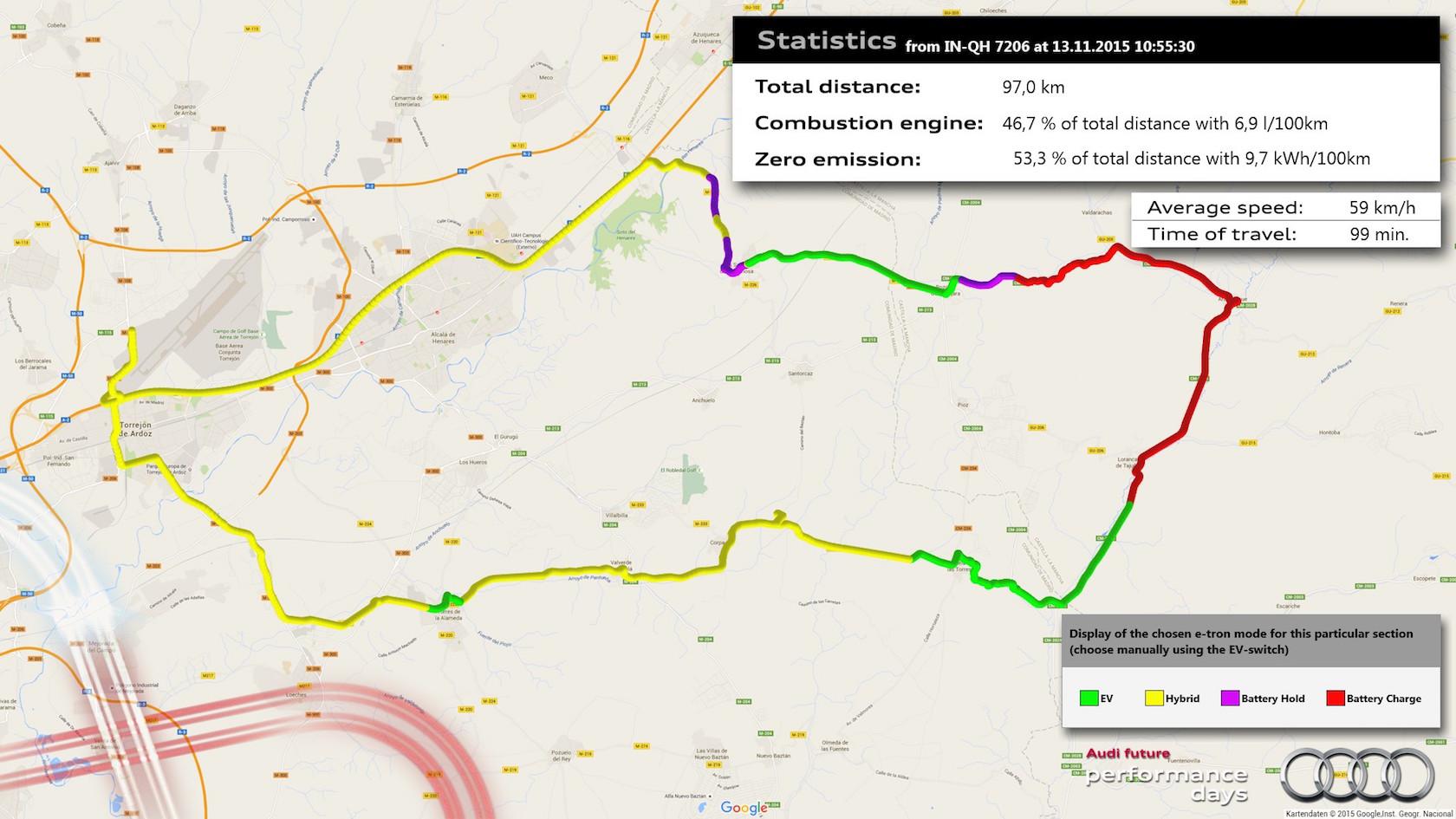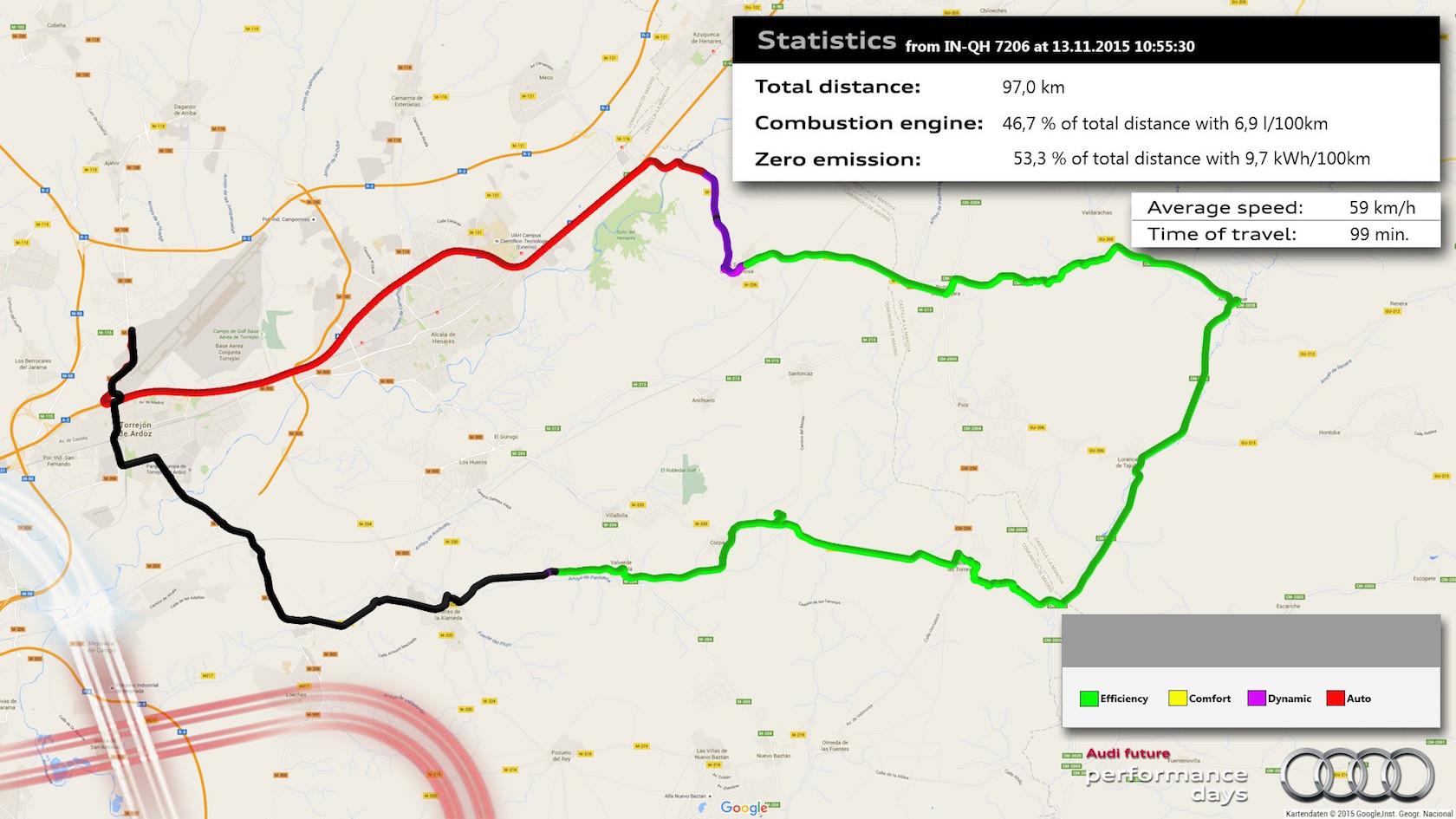 Audi had fitted its small fleet with data-loggers that could contrast what the PEA would do if left to its own devices with how I actually drove. With my fiddling with the hybrid settings, I completed the 97 km (60 mile) route with the combustion engine active 46.7-percent of the time, using a total of 6.9 l/100 km of fuel. That works out to around 35 mpg.