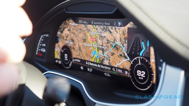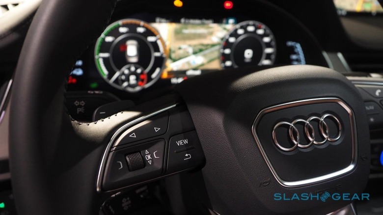 Audi's Virtual Cockpit – a sizable high-resolution screen that fills the driver's instrumentation binnacle – makes an appearance in the Q7, this time with some extra hybrid-related instrumentation. The gages are customizable, flanking a Google Earth map which can be adjusted in size, and show remaining range broken down by electric-only and gas extended.