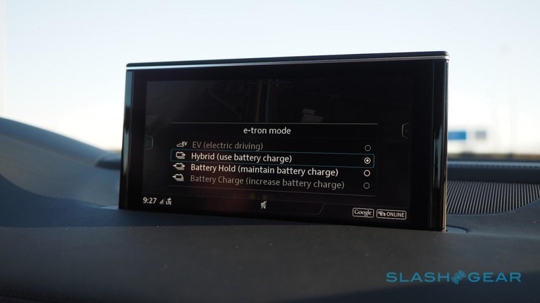 Leave the e-tron in Hybrid mode – as opposed to EV, which uses battery power first; Battery Hold, which saves charge for later; and Battery Charge, which actively replenishes the 17.3 kWh Li-Ion pack slung under the trunk floor – and PEA will automatically figure out when to let the system coast and when to throw in some electrical boost.