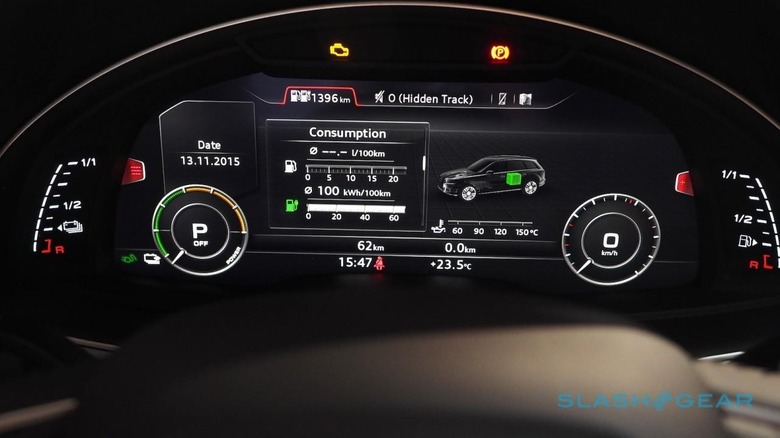 Audi's own numbers are even more impressive: 1.7 l/ 100 km, or a whopping 138.4 US mpg equivalent. Not bad for a sizable SUV packed with all the trimmings, though we'll have to wait for the EPA to weigh in to know final US numbers; electric-only range in the mid-20s is Audi's expectation under those test conditions.