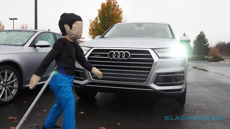 "Now we drive toward the child," Audi's Sebastian Will tells me, dryly. We're strapped into a Q7 and, at the other side of a parking lot, Audi has a child-sized mannequin coyly staged as though it's just absent-mindedly stepping out from behind a parked A4. The SUV accelerates smoothly to up to speed and Will resists the urge to stomp on the brake, trusting in Pre-Sense City to save bambino and bumper.