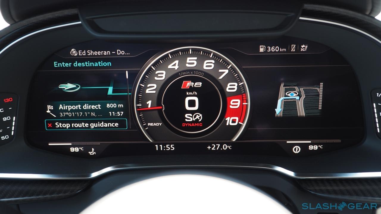 Since all the gages are digital, Audi can take into account more than just the basics a mechanical display might. For instance, the tach/speedo readings are based on engine speed calculated 60 times a second, taking into account inertia, elasticity, and damping. Different Drive Select modes have different display layouts, too, again all customizable.