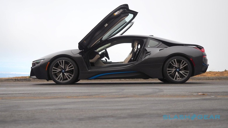 Graceful entry is an acquired talent. The i8's doors may swing upwards on gas struts but you'll still need to duck in order to slide underneath them. Combine that with the fairly wide sills and the car's low stance, and you have a recipe for parking lot embarrassment. After a couple of attempts I figured you need to throw a leg in first and then basically allow your butt to follow, hoping that you don't ruin the whole thing by smacking your head on the underside of the door.