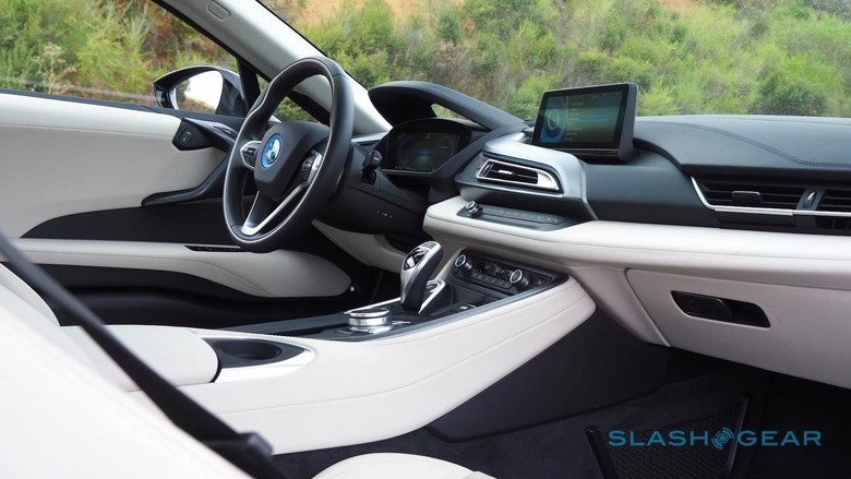 The instrumentation is digital, though it doesn't stray too far from what you'd see in any other BMW. Atop the center stack there's a free-standing LCD, controlled with the automaker's familiar iDrive joystick and scroll-wheel. A rocker switch flips the i8 between Comfort and ECO PRO modes; pushing the gearstick to the left engages Sport mode, at which point the digital graphics turn red.