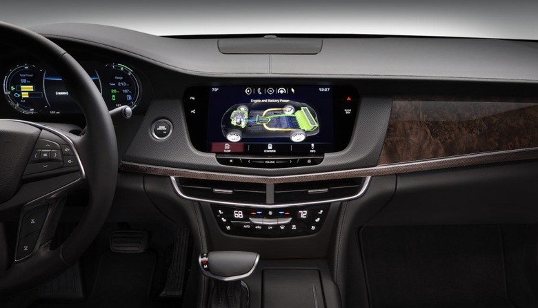 Inside, the Cadillac gets new graphics for both its center stack touchscreen and the driver's digital binnacle. They show where power is coming from at any moment in time, whether that be the gas engine, the battery-powered motors, or some combination of the two, or if the batteries are in fact being recharged by regenerative power. Since all current Cadillac models are connected, you'll be able to pull up range details and other information from the company's smartphone app.