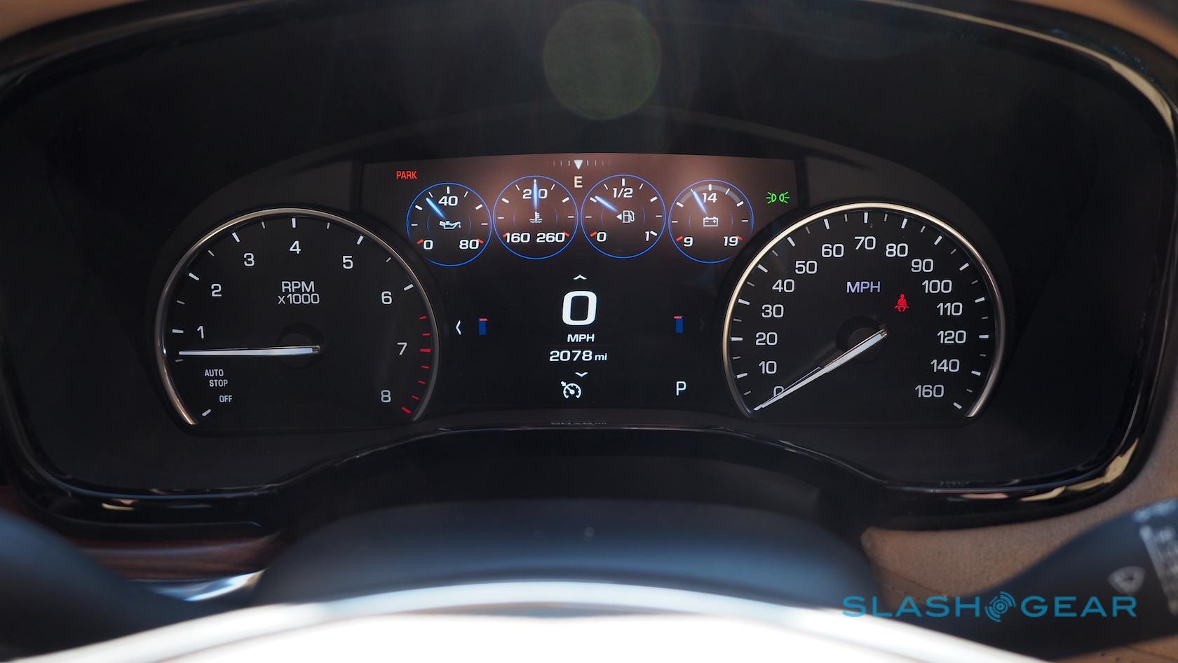 Cadillac puts a sizable LCD between the analog speedo and tachometer, which I like, but then monopolizes a huge chunk of it with dials for engine temperature, fuel level, oil temperature, and battery charge. I've no doubt they're useful if you're off-road in the dessert, but I'd have preferred smaller gages and a bigger navigation display, or media information.