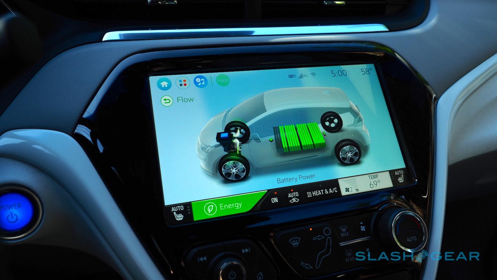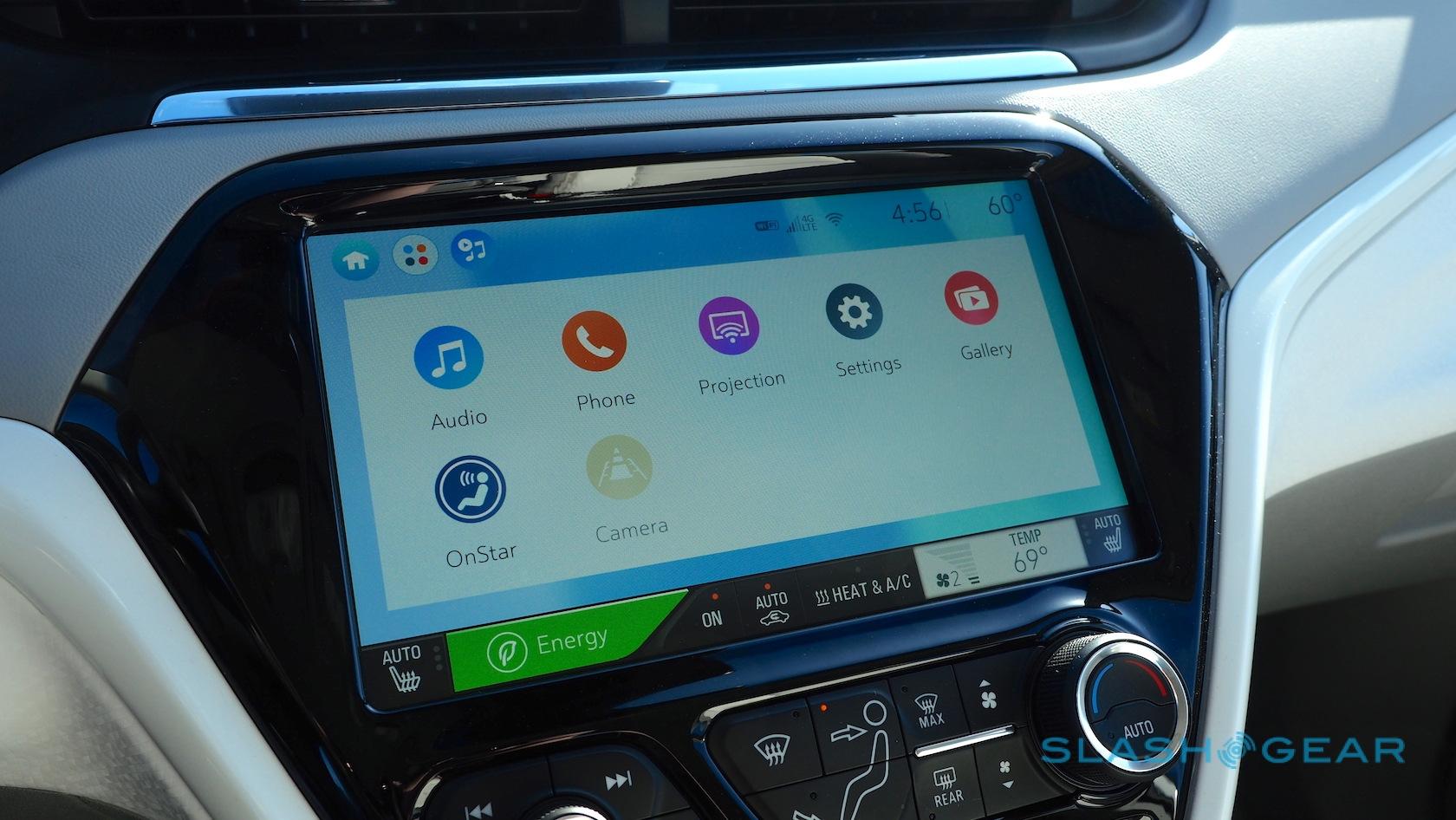 The driver gets an 8-inch LCD for instrumentation, with a choice of three layouts. Chevrolet calls them "Classic", "Modern", and "Enhanced" but really they differ by how granular the power data is they show you. At one extreme, your frugality (or otherwise) is shown with a simple leaf meter; at the other, you get a real-time readout of how many kilowatts are currently being expended. The Bolt EV also uses a color-coded ring to give a more subtle indicator of how green you are.