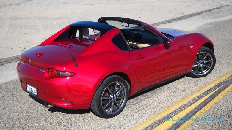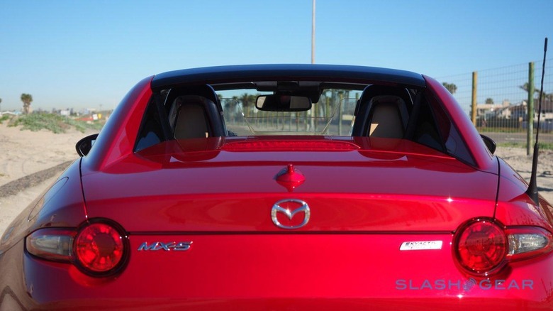 The roof itself is something of a logistical marvel. It opens or closes in just 13 seconds, the fastback section lifting as the roof and glass rear window pull back, pivot, and gracefully sink into the space behind the rear seats. You can operate it while driving, too, though only at up to 6 mph. Mazda tells me that's because any faster and those with long, flowing hair might find it caught up in the mechanism.