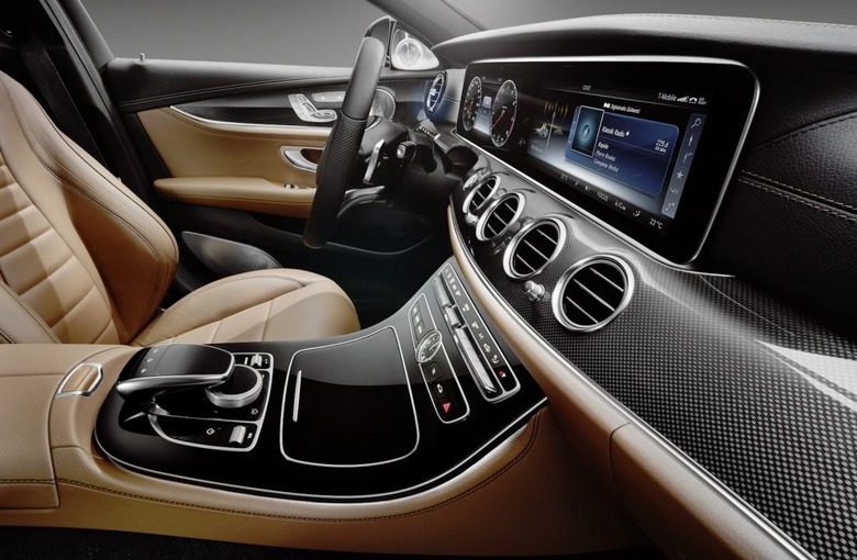 Mercedes has embraced the digital cockpit in a big way, and the E300's dashboard is dominated by a pair of 12.3-inch widescreen LCDs. The driver's is an $850 option, with configurable virtual gages, while the center panel is standard, for navigation, multimedia, and more. Neither supports touch, mind; instead, control comes courtesy of a trackpad in the center console, together with a jog-wheel and a cluster of shortcut buttons.