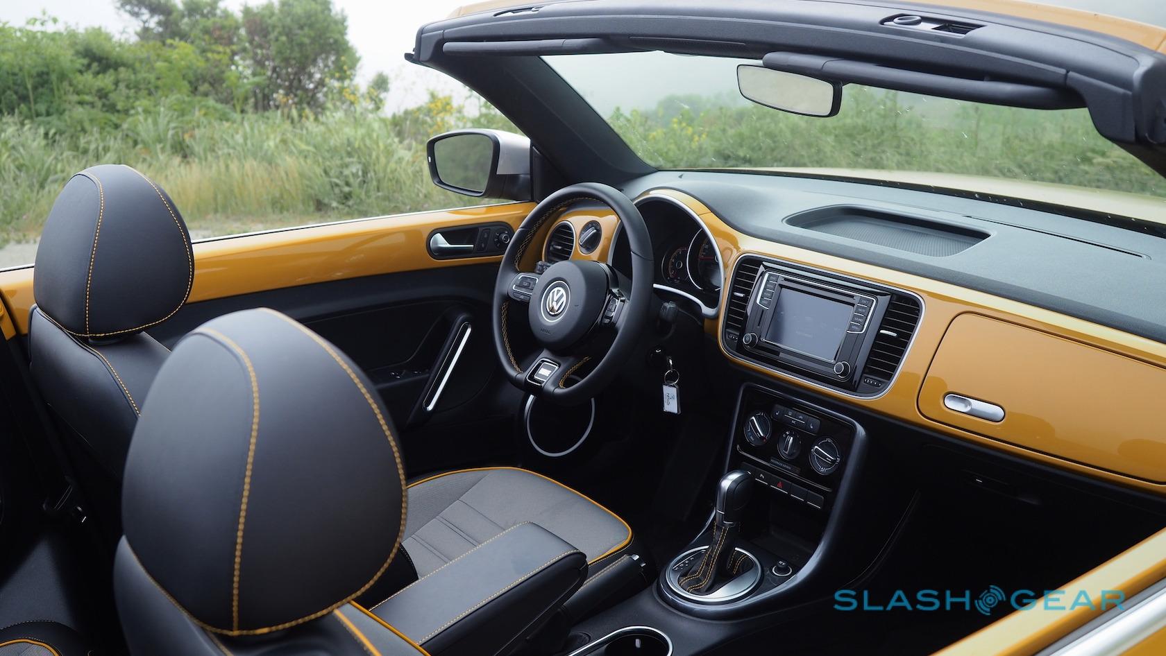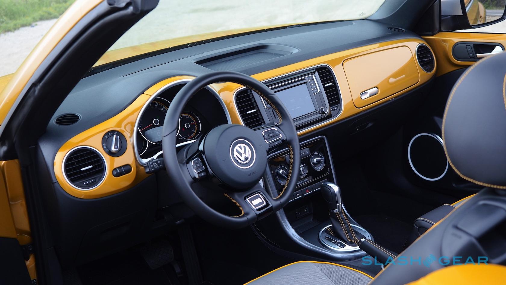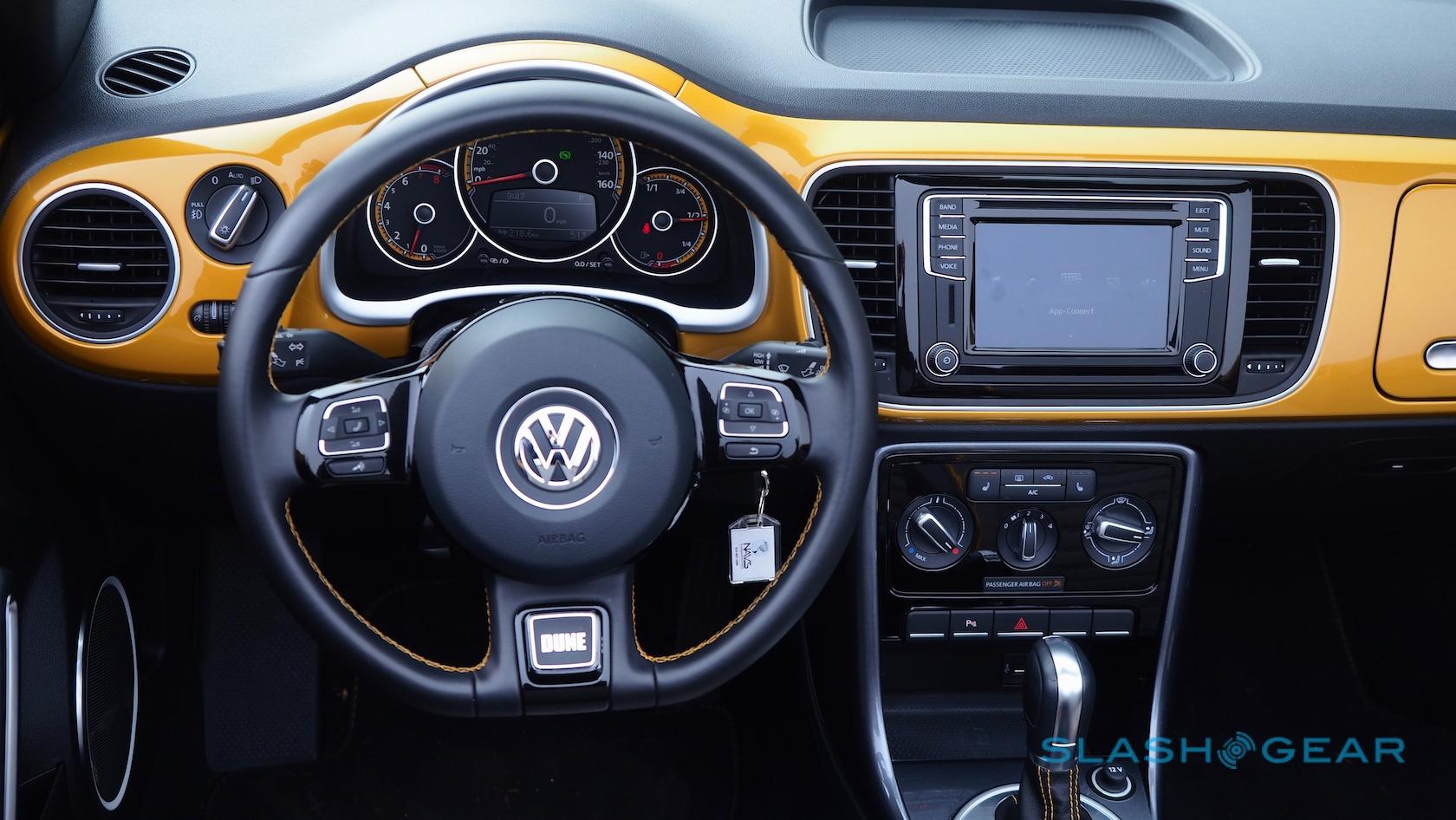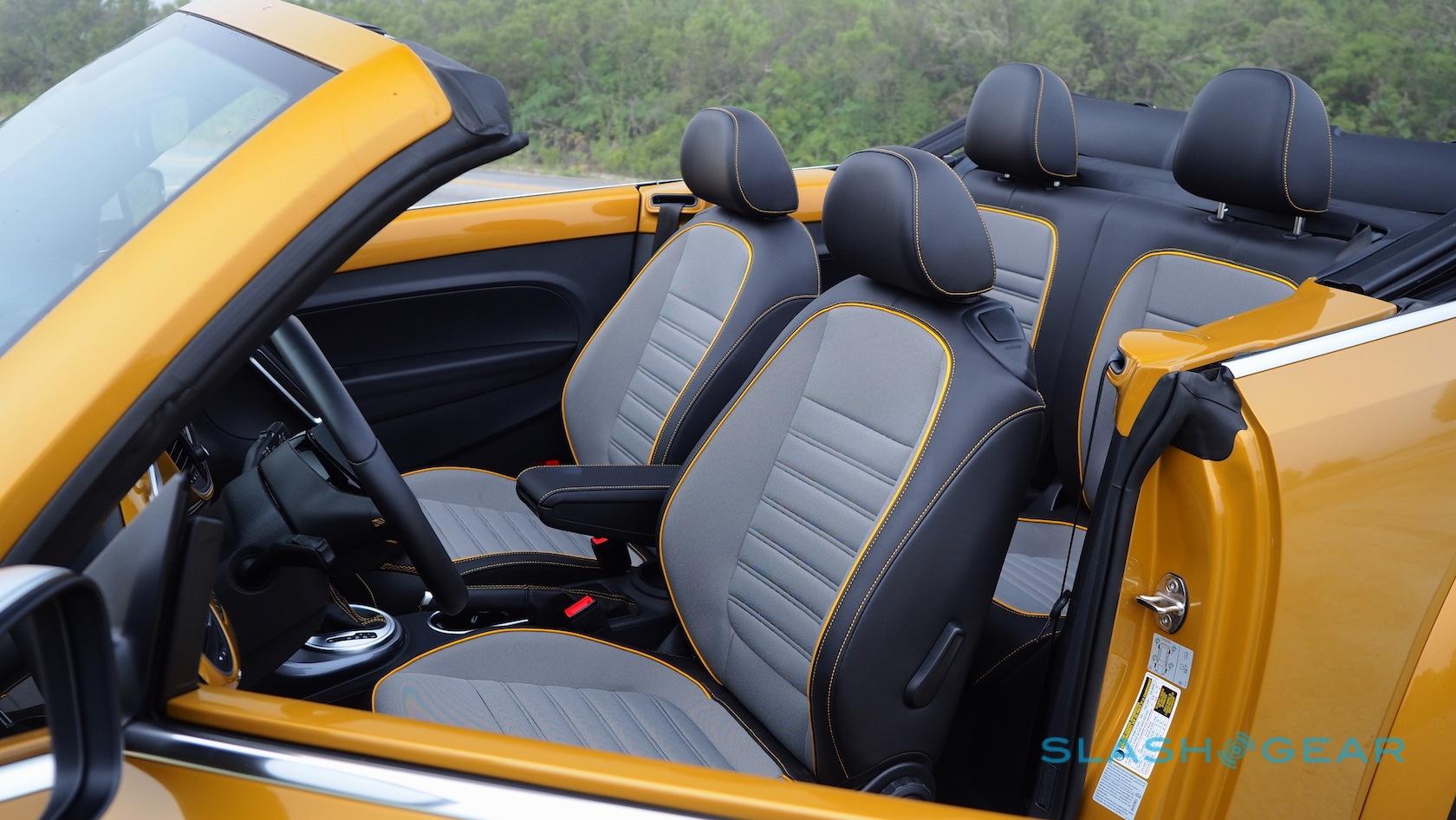 Otherwise, the Beetle Convertible's standard leatherette seats are replaced with special Dune fabric versions, handsome enough with their two-tone grey and yellow piping. They're fearsomely heated, too, as are the windshield washer nozzles. Unfortunately the wheel doesn't follow suit.