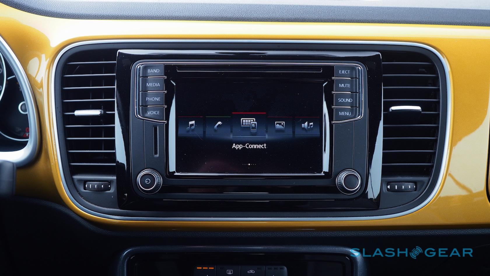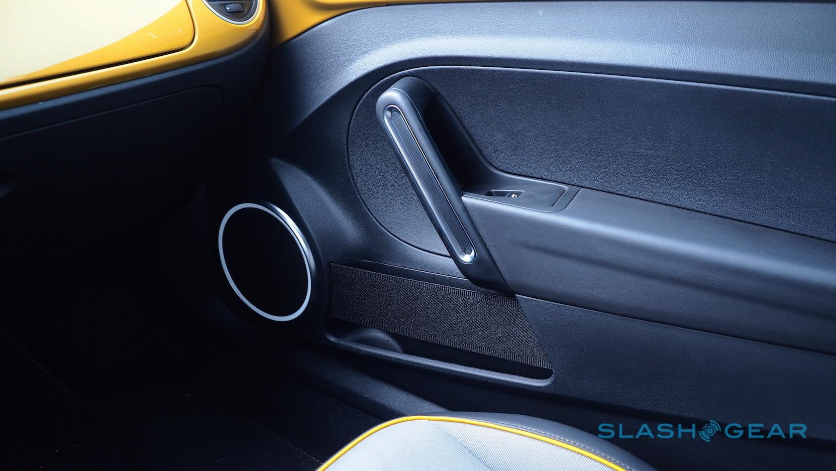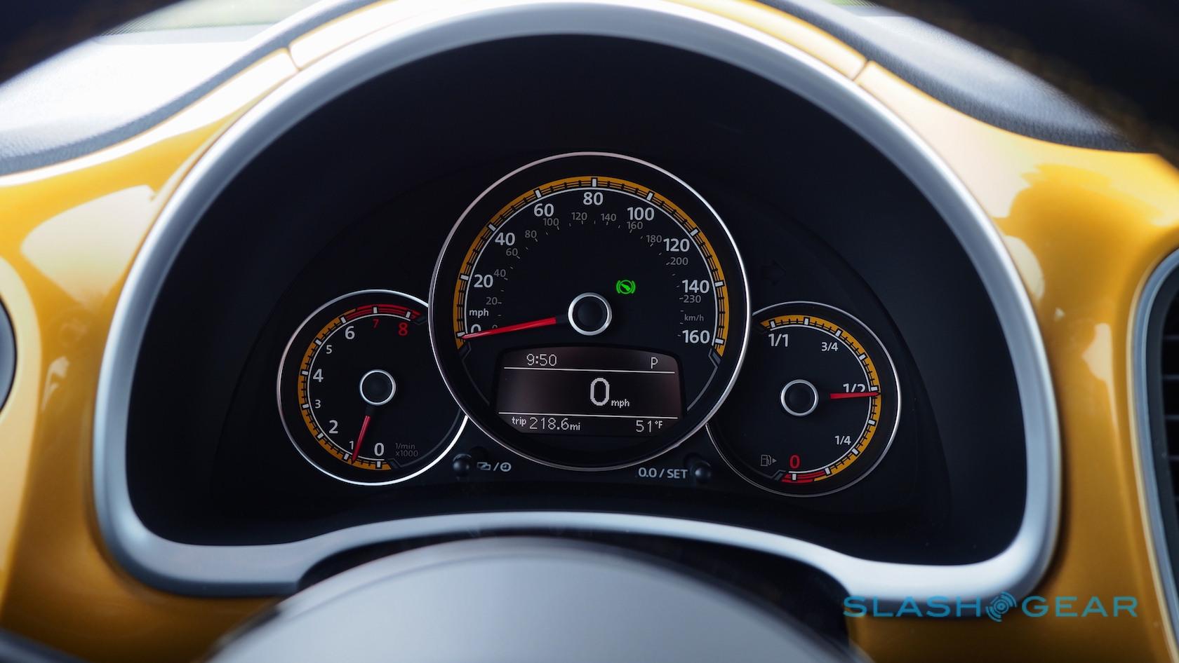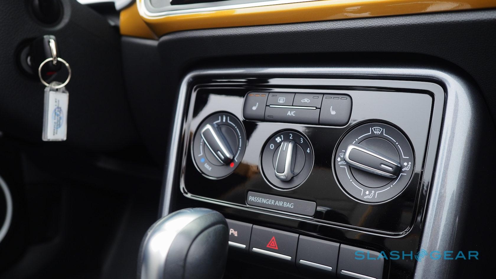 Otherwise, the Beetle Convertible's standard leatherette seats are replaced with special Dune fabric versions, handsome enough with their two-tone grey and yellow piping. They're fearsomely heated, too, as are the windshield washer nozzles. Unfortunately the wheel doesn't follow suit.