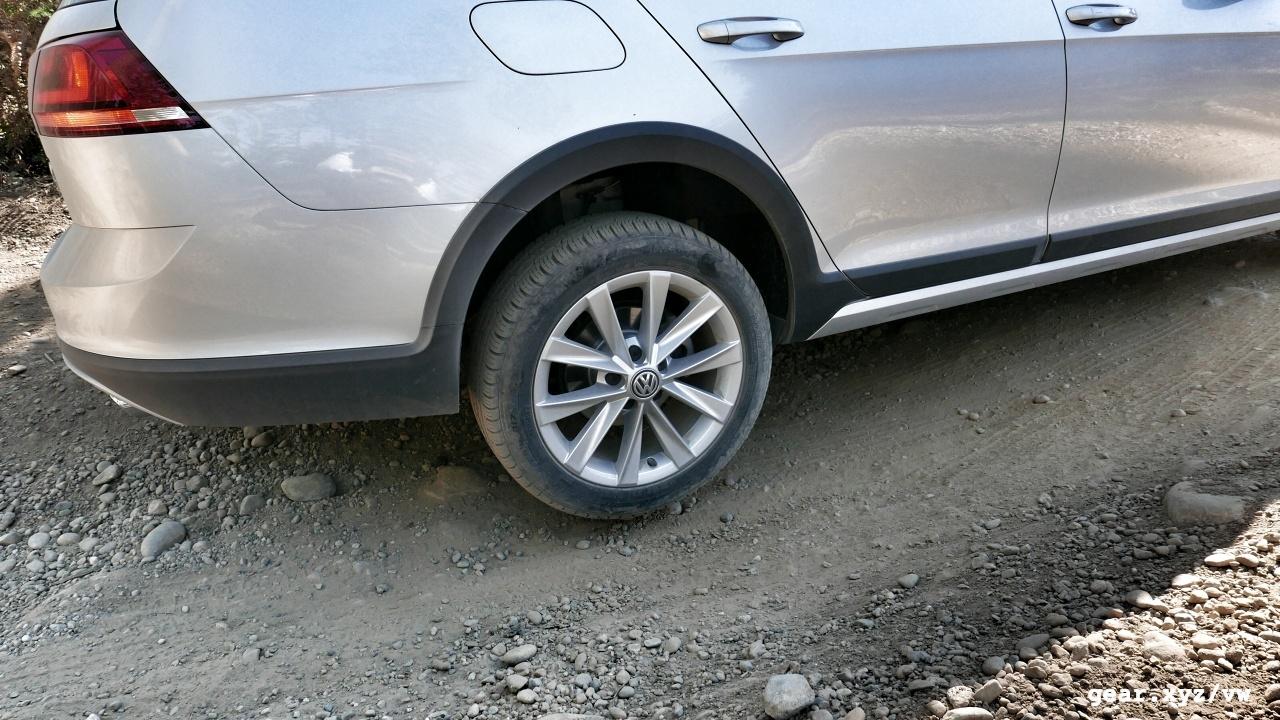Taken together with the 0.6 additional inches in ground clearance (with wheel gap visually expanded by flared fenders and taller tires), it's fair to say that the Alltrack will handle muddy roads with ease. On the short up-and-down trail laid out for me to drive the Volkswagen through on Washington state's Bainbridge Island, the car performed admirably enough, but it's important to remember that there's still a Golf chassis sitting underneath the revised packaging, and that it would be a mistake to expect the Alltrack to take much of a real-world beating.