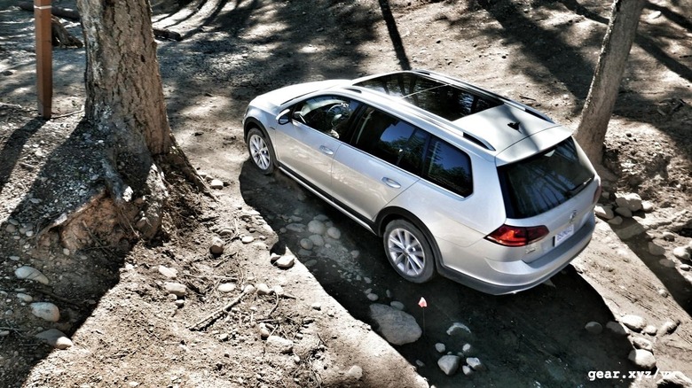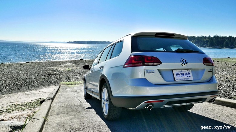 Taken together with the 0.6 additional inches in ground clearance (with wheel gap visually expanded by flared fenders and taller tires), it's fair to say that the Alltrack will handle muddy roads with ease. On the short up-and-down trail laid out for me to drive the Volkswagen through on Washington state's Bainbridge Island, the car performed admirably enough, but it's important to remember that there's still a Golf chassis sitting underneath the revised packaging, and that it would be a mistake to expect the Alltrack to take much of a real-world beating.