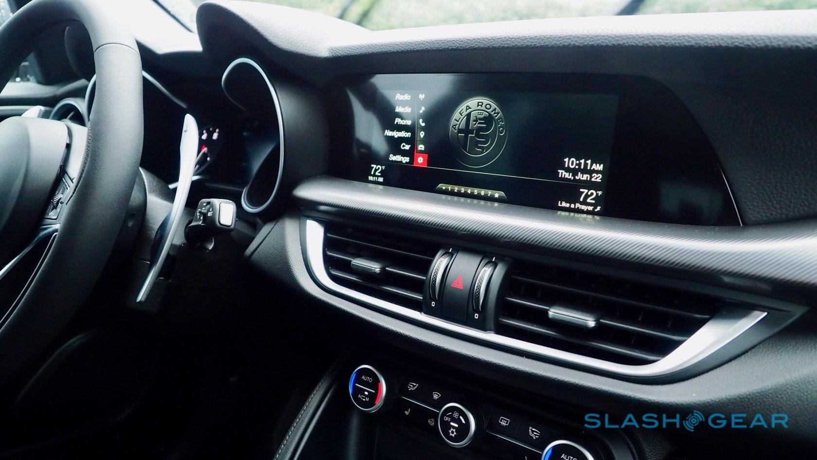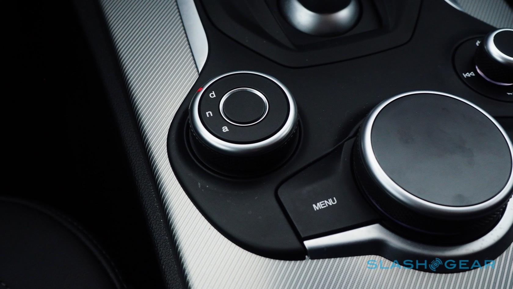 It wouldn't be an Alfa without some oddities, of course. The weird display also suffers a tiny reversing camera preview, which just a few raindrops can obscure. The start/stop system is clunky and lacks finesse; the first thing Alfa's team did when we got behind the wheel was show us how to turn it off. The brakes aren't short on power – 13-inch rotors and four-piston Brembo calipers up front, along with 12.5-inch, single-caliper discs at the back – but there's a fair amount of pedal travel before you reach its bite. Highway economy of 28 mpg is impressive, on paper at least; with a mixture of roads and some more spirited driving, we saw more like 23 mpg.