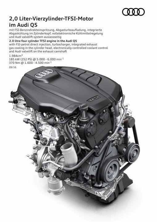 Audi's 2.0-liter turbocharged 4-cylinder engine is good for 252 HP (an increase of 38 HP) and 273 lb.-ft. (an increase of 15 lb.-ft.) of torque. It's mated to a 7-speed automatic transmission. This is the exact same engine that's available on the A4, and will soon be added to the Q7 range.