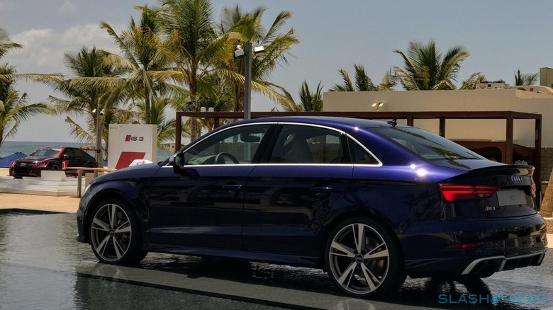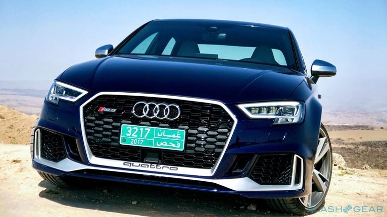 On the outside, while the RS 3 shares the same shell as the A3/S3, is gets a selection of RS-trims like additional air intakes that flank a deeper bumper with "quattro" embossed across the bottom of the grille. The rear is treated to two massive tailpipes, diffusers for reducing lift at higher speed, and a lip spoiler on the trunk lid. If you thought the stance looked meatier than the regular cars, you're not wrong: the front track has been widened by 20mm, a combination of 7mm x 2-wheel offset and 3mm x 2 for a more robust wheel hub. The rear track is 14mm wider, purely from wheel offset.
