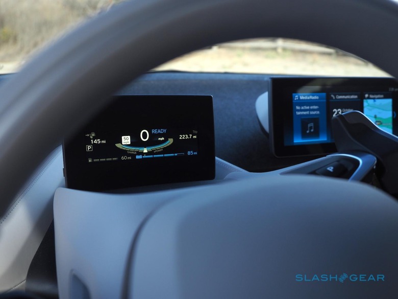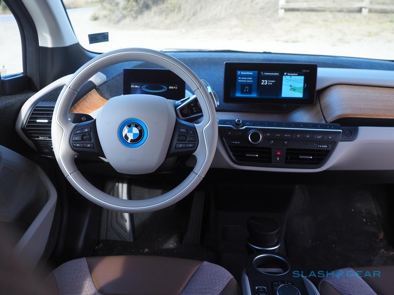 It's a very pleasant step away from the usual black, brown, or cream leather you'd expect to find in a BMW, and the dour dashboard trims, and it gives the cabin an airy, lounge-like feel. The BMWi electric-blue seatbelts are a $300 extra, but they serve as a welcome splash of contrast color. Dashboard displays that seem to float above negative space are another clever design touch, even if they now look small compared to what you'd find in a Tesla Model 3.