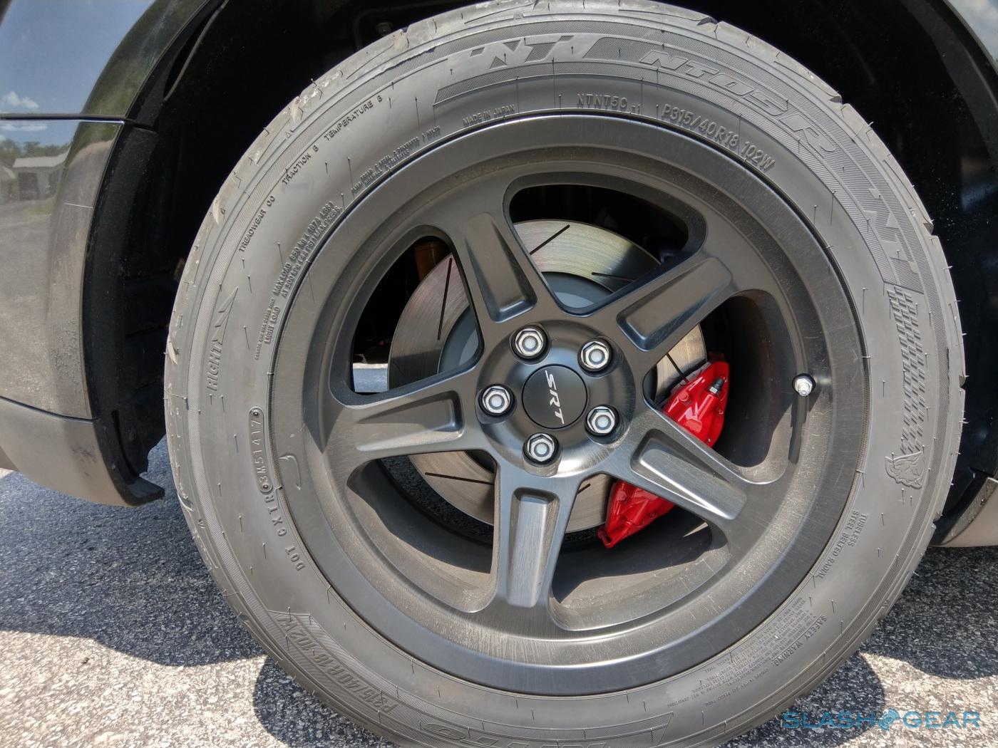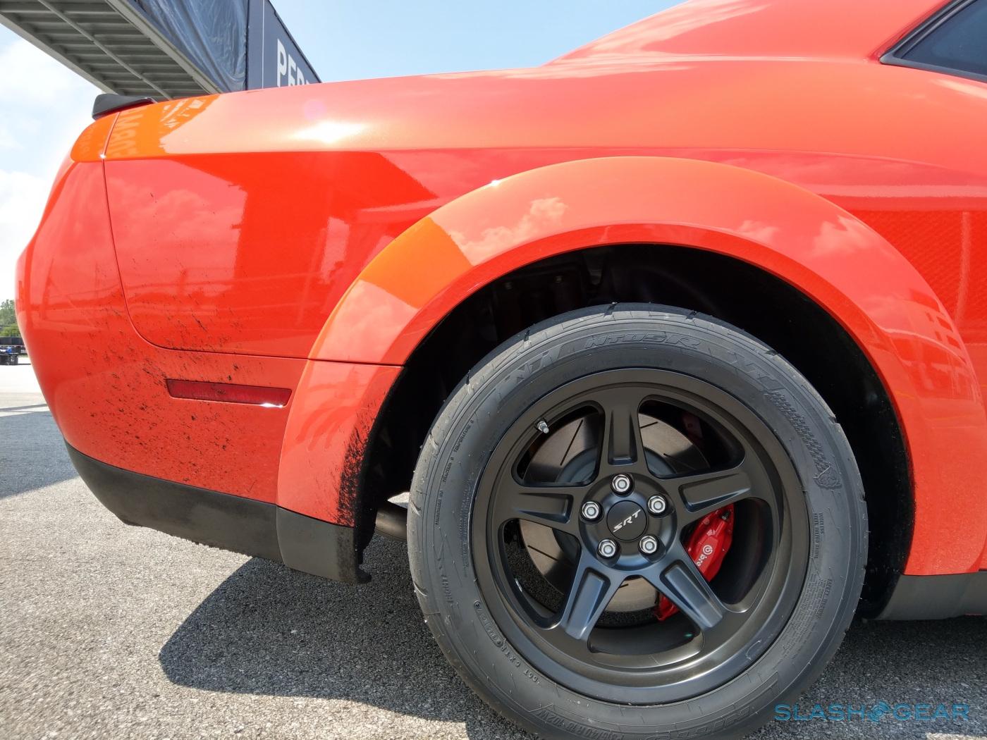 In "Drag Mode," the suspension is tuned for max-pull right off the start, plowing on 1.8G of force that's more than capable of lifting the front end and tires right off the ground. Since suddenly they're responsible for a whole lot more work than the typical car requires, the rear tires aren't just shod with any old rubber. Instead, they're Nitto 315/40R18 drag tires, so you know they're going to stick.
