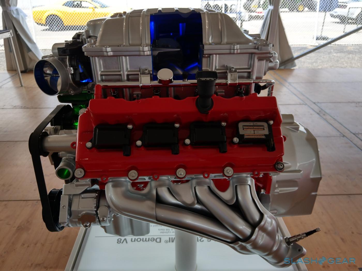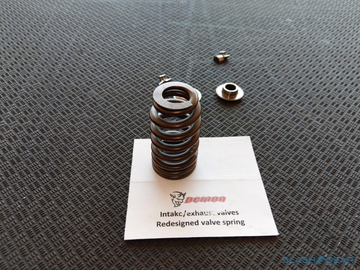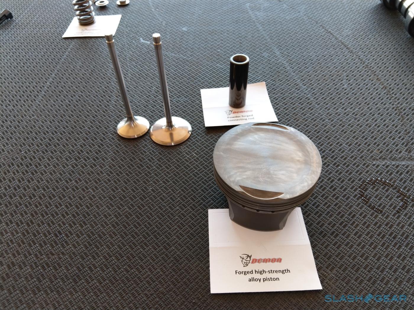 Turning the Hellcat engine into a Demon required twenty-five component changes. Boost pressure is up 20-percent, supercharger capacity increased from 2.4 to 2.7 liters, there were changes to the valvetrain and fuel injection, new pistons, and the conrods and crankshaft peaks increased peak revs from 6,000 rpm to 6,300 rpm. In the process, the supercharger gobbles up more air and fuel than any other production car: there simply isn't another engine in the world that can beat the 6.2-liter supercharged Hemi in fuel flow rate.