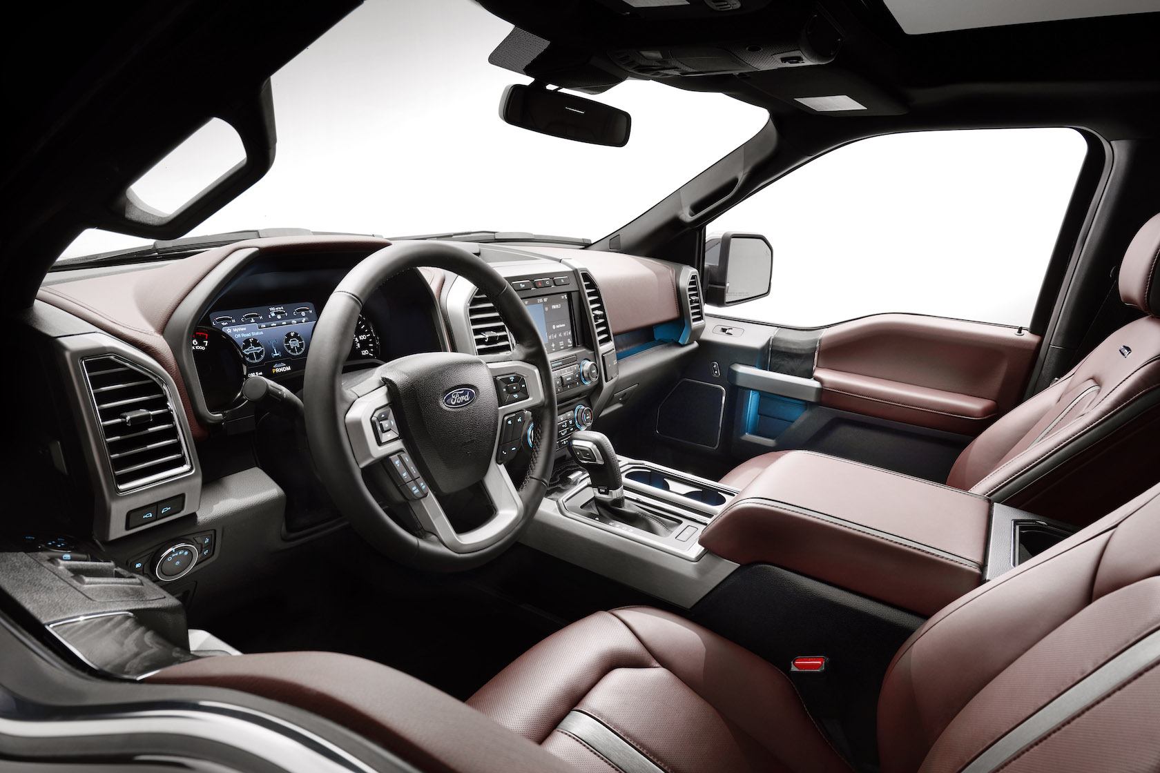 Inside, there's now two new seating trim options. The F-150 Platinum gets Dark Marsala, while the F-150 Limited has Navy Pier. The F-150 XLT Sport and Lariat Sport get carbon-fiber style trim inside, while the F-150 King Ranch has new Kingsville Appointed seats.