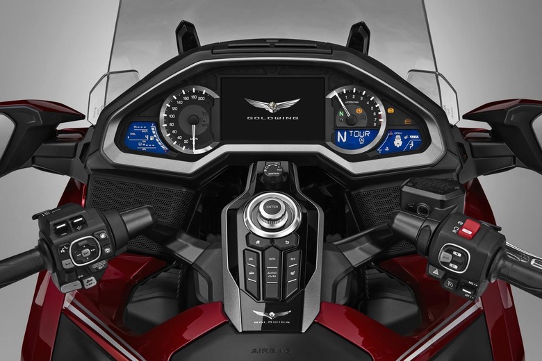 If you don't want the manual transmission, Honda is offering a seven-speed automatic dual-clutch transmission. That includes a forward/reverse Walking Mode for easier transportation of the Gold Wing. Manual or auto, there's throttle-by-wire and four new riding modes: Tour, Sport, Econ, and Rain. Honda Selectable Torque Control (HSTC) and Hill Start Assist are available too, together with cruise-control.