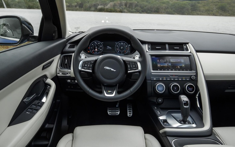Unlike international markets, which will get both FWD and AWD options and a choice of engines that includes turbodiesels, Jaguar is keeping it simple for the US. Every American E-PACE will be all-wheel drive, and there'll be just two engine options, both using the same 2.0-liter turbocharged four-cylinder. One is tuned for 246 horsepower and 269 lb-ft. of torque; the R-Dynamic, which I spent my time in, bumps that up to 296 horsepower and 295 lb-ft.