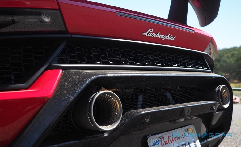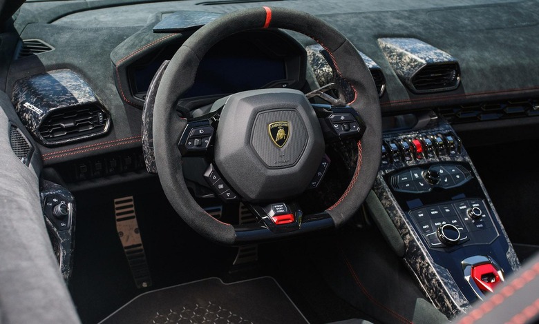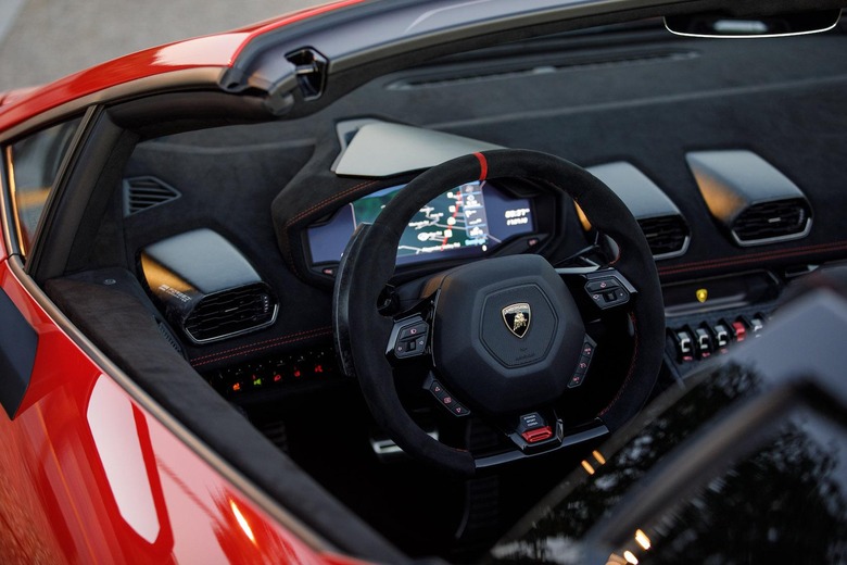 Alcantara wraps the seats, the steering wheel, the dashboard, and the doors. Lamborghini offers plenty of contrast stitching options along with a hexagonal perforation design that laces a little extra color through what could otherwise be a fairly intimidating cabin. A bright red guard flips up to give thumbing the starter button the right sense of melodrama; a chromed yoke clicks the transmission into reverse.