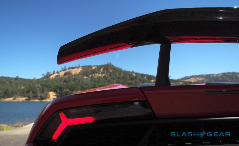 At the back, meanwhile, two electric flaps at the base of the rear wing struts open and close automatically. Open, they send air up through those struts and out through slots under the wing, leading to minimal drag for maximum pace. Closed, meanwhile, they add more drag, contributing to the Lamborghini's downforce.
