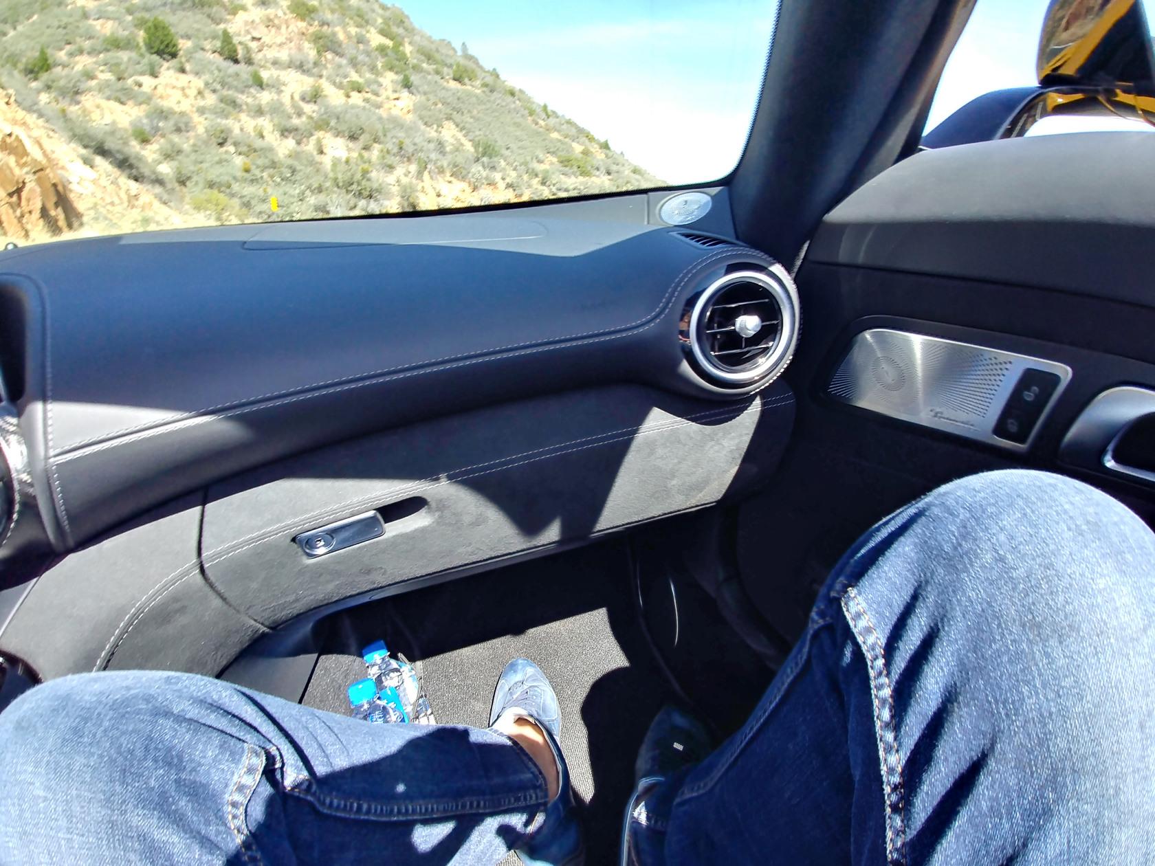With the engine shoved so far beyond the firewall, you can't help but feel snug inside the cabin. Perhaps intimate might be a better word to describe the feeling. It's not cramped, though, and I never felt uncomfortable during our 300-mile road trip. The AMG performance seats are supportive and handsome, while between them is a hulking center console, forced upon the interior due to the mid-engine placement. On the plus side, that does mean there's enough room for a pair of cup holders.