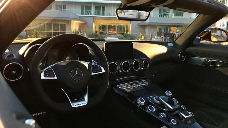 With the engine shoved so far beyond the firewall, you can't help but feel snug inside the cabin. Perhaps intimate might be a better word to describe the feeling. It's not cramped, though, and I never felt uncomfortable during our 300-mile road trip. The AMG performance seats are supportive and handsome, while between them is a hulking center console, forced upon the interior due to the mid-engine placement. On the plus side, that does mean there's enough room for a pair of cup holders.