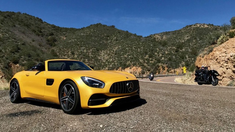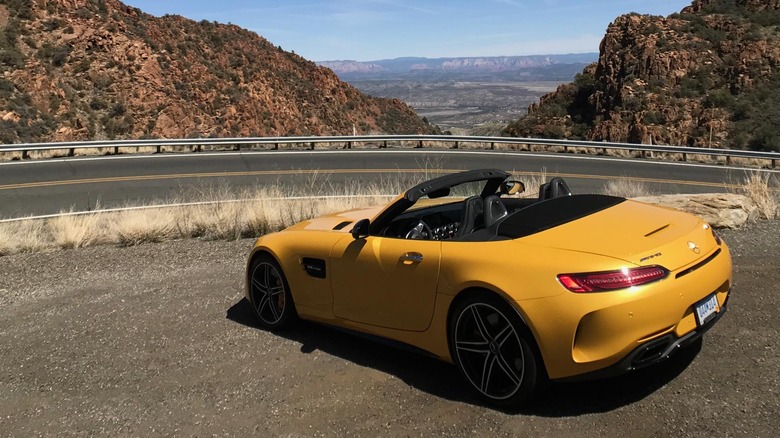 Luckily, my fun in the sun with Mercedes-AMG's new GT C Roadster in Arizona didn't come to a premature end when my driving partner got a speeding ticket. The topless Solarbeam Yellow GT cruiser shot out as though the canyon had just given birth to it... and that happened to be the exact spot where we drove past the state trooper. I sat quietly in the passenger seat as he explained to the officer, "it's this stupid car, it feels like it's going 60..." only to have the officer reply "you're really flying, I clocked you at 90 mph."