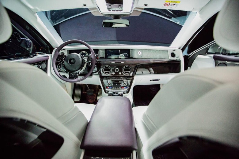 The power-doors close automatically, both front and rear, and in the cabin there's no shortage of luxury. A huge Starlight Headliner puts LED pinpricks of light overhead, and there's a vast selection of different wood veneers that can be selected for the door interiors, center consoles, dashboard, and picnic tables. Power-operated rear tables and displays motor out of the back of the new, hand-sculpted seats. Rolls-Royce will offer lounge, individual, individual with fixed center console, and a new "Sleeping Seat" options for the rear.