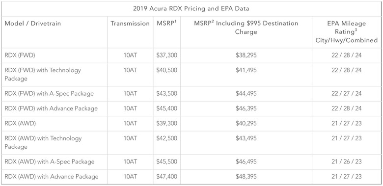Pricing for the 2019 RDX kicks off at $37,300 for the front-wheel drive entry-level model, plus $995 destination. It'll do 22 mpg in the city, 28 mpg on the highway, and 24 mpg combined. The RDX FWD with Technology Package keeps those EPA numbers and steps the price up to $40,500 plus destination.
