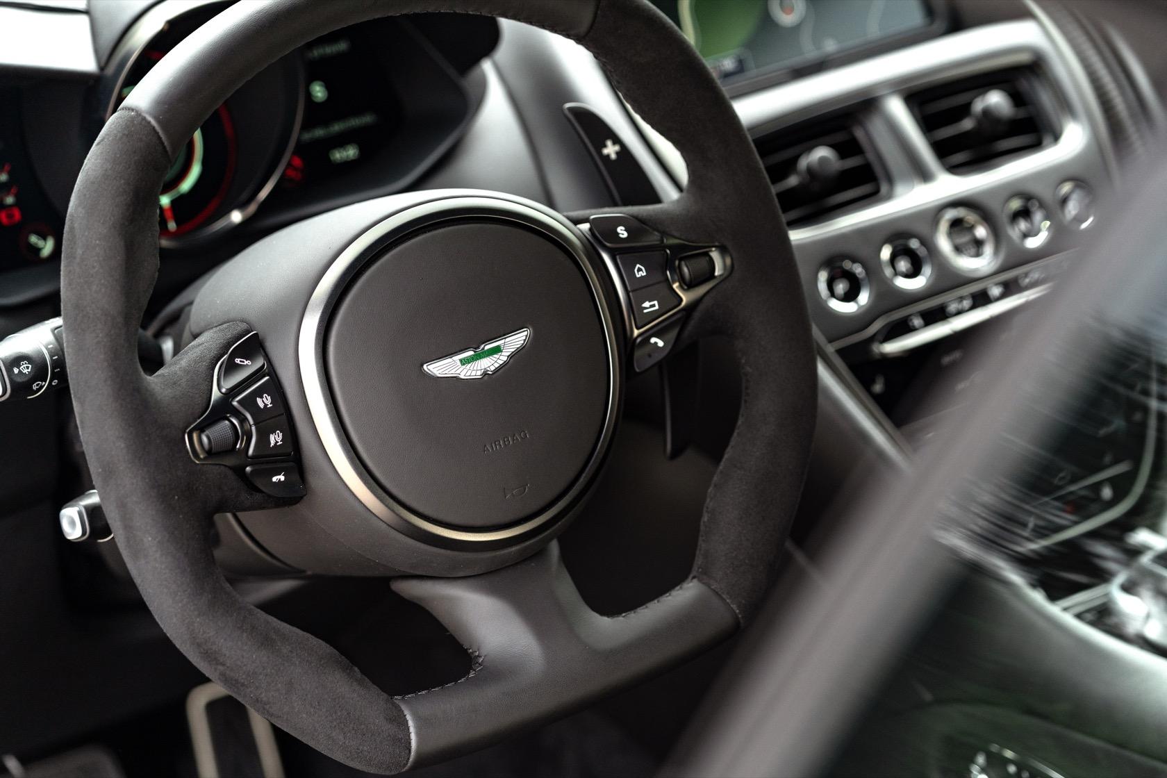 Either way, you get a carbon fiber front splitter, rear double diffuser, and aeroblade spoiler to help push the rear tires harder to the ground. It adds up to 397 pounds of downforce at the top speed of 211mph, the highest of any Aston Martin production road car.