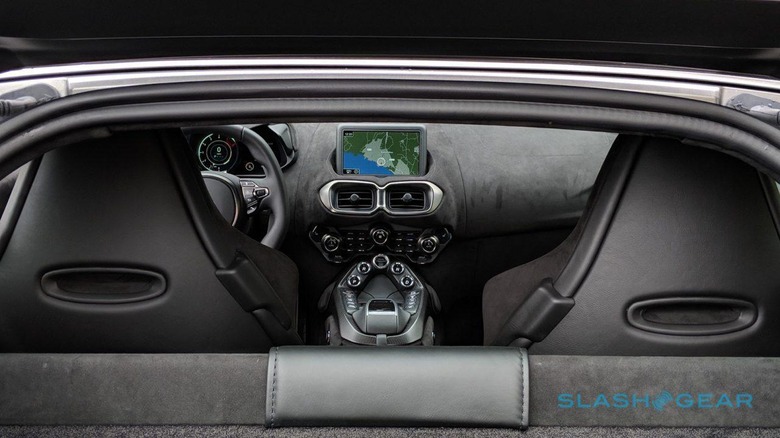 Gone is the "waterfall" center stack, opening space for the upcoming manual gear shifter. The 8-inch center display, along with the new air vents, knobs, and switches look much better to my eyes. Cleaner, and less fussy. There's an Aston Martin audio system, navigation, and WiFi, too, but make no mistake, the primary goal was wrapping something eminently functional around the driver.