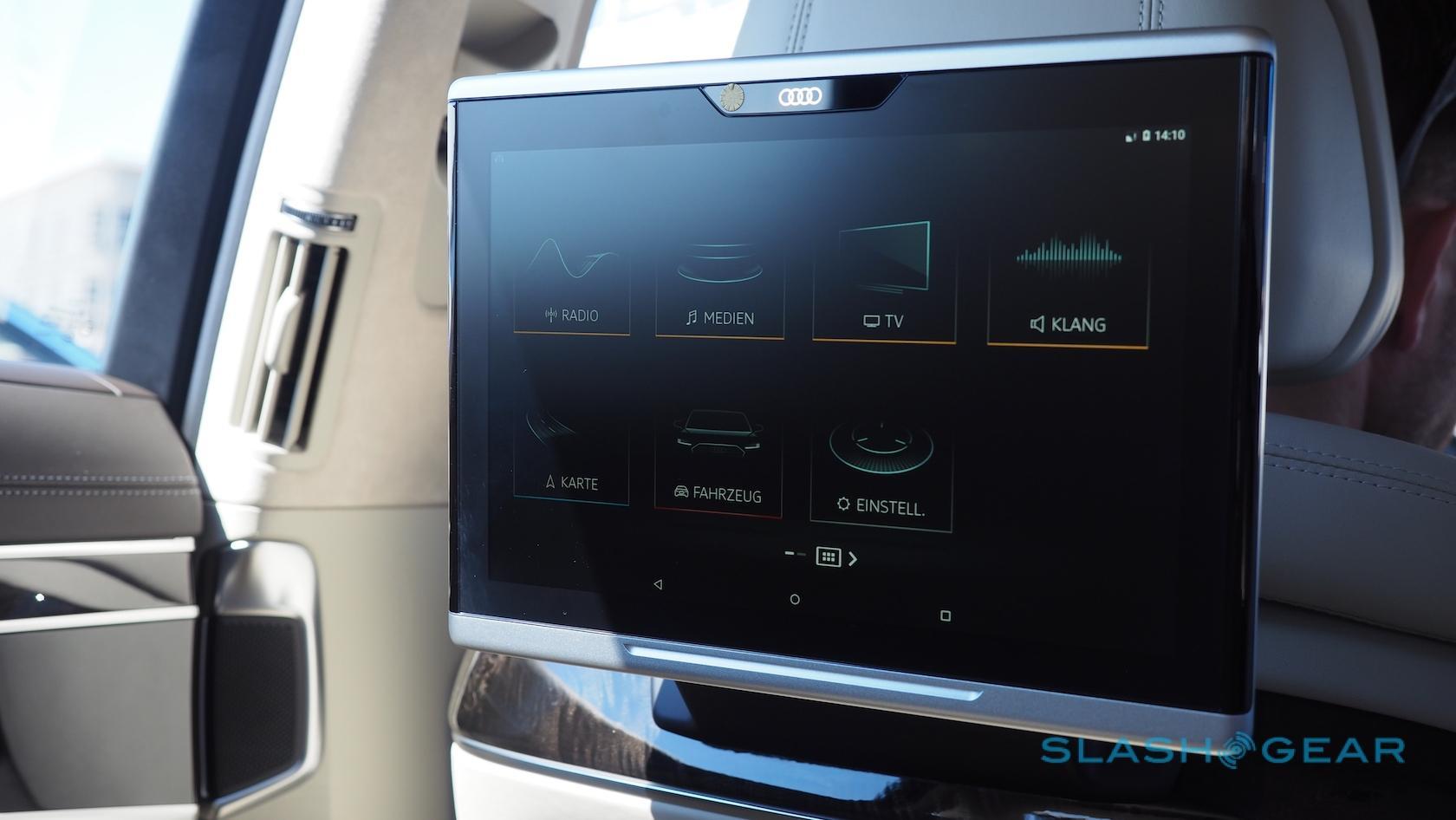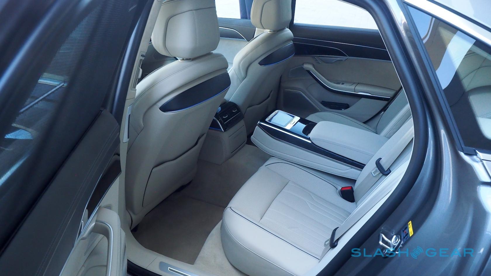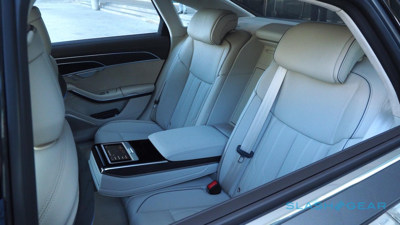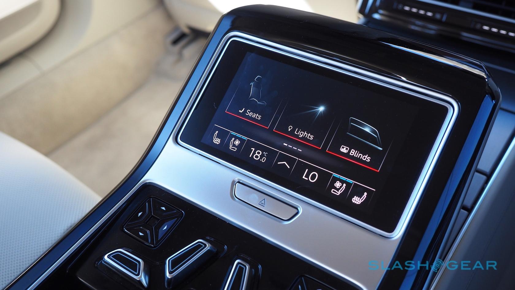 Inside, the cabin has been completely updated. The A8 gets seating for five, the A8L for four courtesy of a full-length center console and armrest. As well as heating, cooling, and massage options, there's a "relaxation seat" package that adds a foot massager for the rear right seat, four-zone climate control, Audi's detachable Android-powered tablets mounted behind the headrests, and a Rear Seat Remote. The latter, about the size of a phablet, pops out of the center armrest and can be used to control multimedia, seat and window settings, and even work as a phone handset for the A8's VoLTE system.