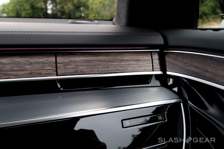 Let's start with the interior design. Audi designers want those who enter the A8 to feel welcomed with open arms, and once the door closes, surrounded in a comfortable embrace. On placing one's posterior in the A8's noticeably comfortable leather seats, your attention shifts to the cleanliness of the lines and comfortable balance of materials. It's the antithesis of many upper-echelon luxury cars that sometimes that on the appearance of a 'mood-board smorgasbord.' Instead you are presented with a well-appointed, minimalistic collection of matching textures and tones, that wouldn't be out of place in a modern downtown apartment's interior. To my eye, the most pleasing interior combination was the Sarder Brown leather with the natural Ash timber inlays, an elegant grey-brown color reminiscent of dark coffee.