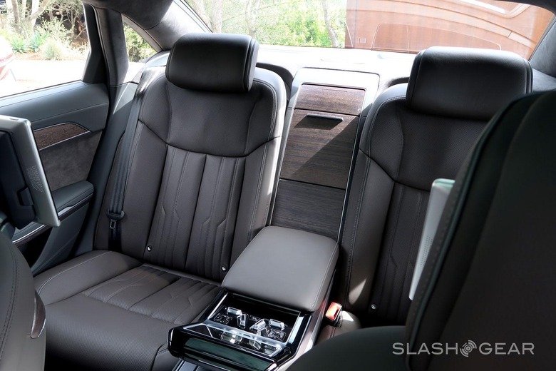 However, if the space in the back is going to be more about productivity as you shuttle between board meetings, then you'll likely appreciate the folding productivity tables and utilize the large and brightly lit displays behind the front seats.