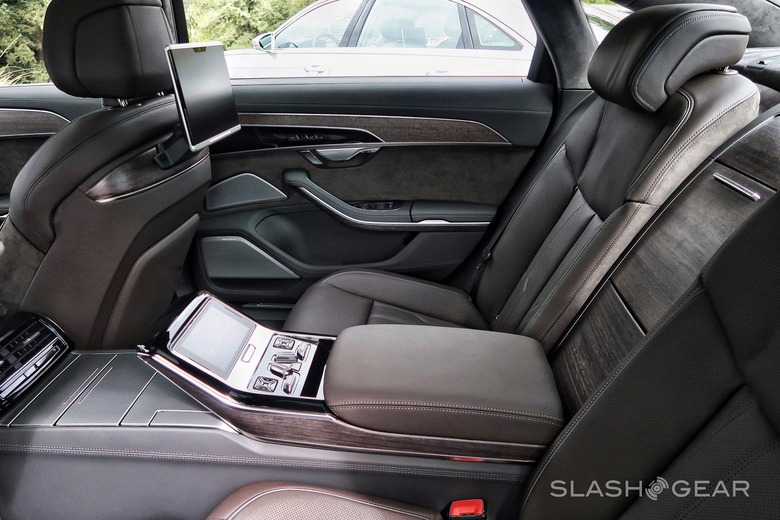Getting there, in the back of the Audi A8 provides its own focused experience. First, the space in the back is capacious. There's no way you'll be bruising your knees on the back of the front seats, in fact there's enough room to comfortably stretch out. It's without reserve, a first-class space. The rear seats have multidirectional adjustments, and the in-seat massagers have been updated with additional massage nodes for both the front and rear seats. I already consider Audi to deliver best-in-class seat massagers, and the updated systems in the A8 continue this tradition. To further enhance your comfort, an air-quality package for ionization and aromatization is available, as are heated center and door armrests to further enhance comfort.