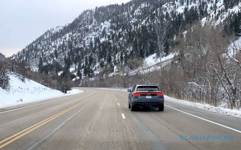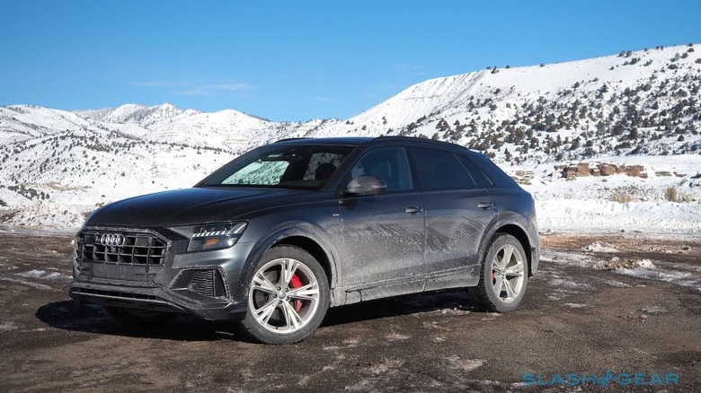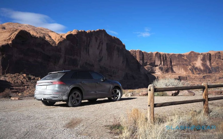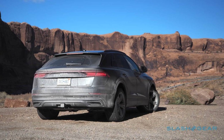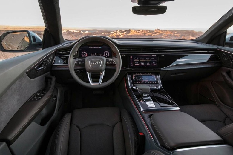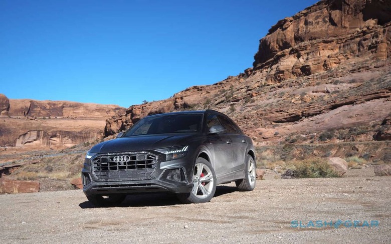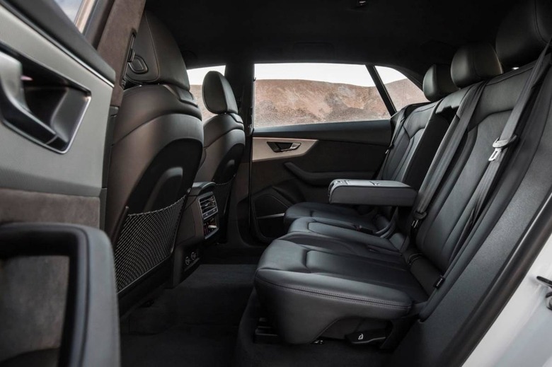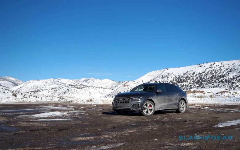 Design hasn't overtaken practicality, mind. That raked rear windshield still allows for more than 60 cubic feet of cargo space with the seats flat, or over 30 with them up; the rear seats still split in three, and have adjustable slide and recline. Since Audi envisages the Q8 being high-end transportation for four, though, rather than a family SUV like the Q7, the outboard rear seats are wider than the center. Quattro all-wheel drive is standard, and proved perfectly stable even as I threw snow, ice, and mud at it. Terrain you wouldn't want to point your A8 at is easy pickings for the Q8.