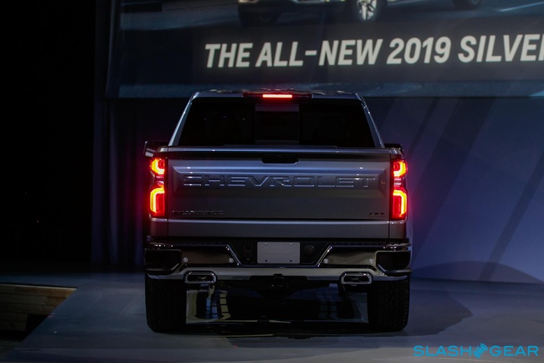 Up to 33-inch diameter tires can be spec'd, while there are now integrated dual tailpipes at the back on every model. The sensors that were once integrated into the taillamps have been repositioned to the rear bumper so that there are no dead spots in the 2019 Silverado's lamps. A spoiler on the back of the cab helps with airflow, boosting aerodynamics and efficiency.