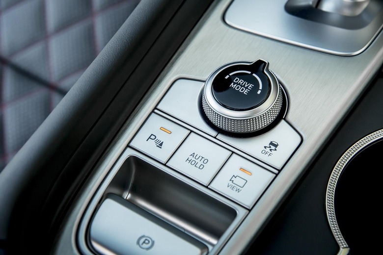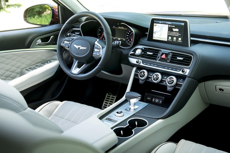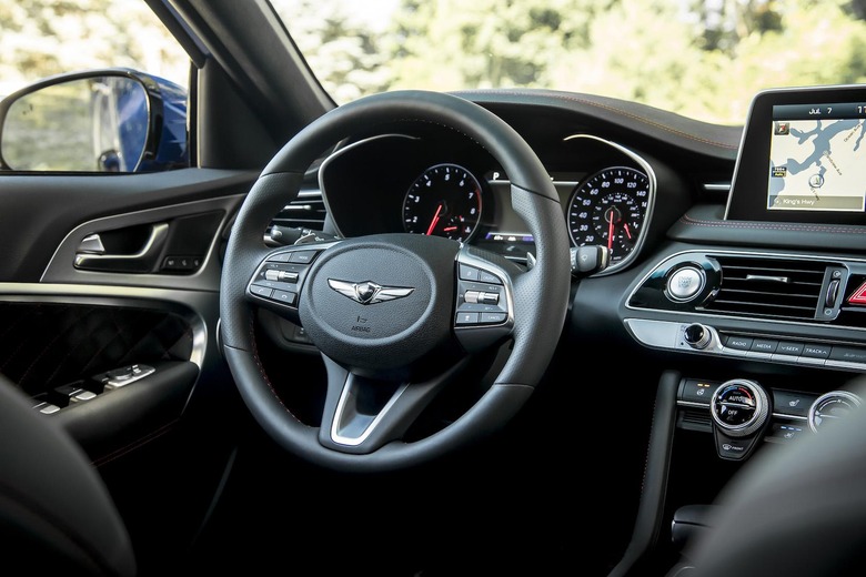 All well and good, but that embrace of gadgetry only serves to highlight some of the other, less welcome decisions. The 8-inch touchscreen perched atop the dashboard feels small, uses the same graphics as a Hyundai half the G70's price, and there's no full-digital instrumentation option, only a smaller color display sandwiched between analog gages. You can't use the LTE connection as a WiFi hotspot, something Genesis told me was a conscious decision (and a baffling one, at that). There are buttons and switches and dials everywhere – some more than a little familiar for those stepping in from a Stinger GT – leaving the cabin feeling more cluttered than it needs to be.
