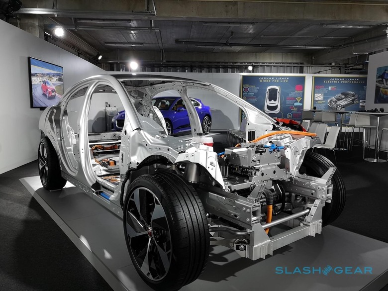 As you'd expect, the 90 kWh battery is sandwiched neatly into the floor plan, and Jaguar makes it an integral part of the chassis in the I-PACE. The unexpected benefit is that, unlike the F-PACE – Jaguar's gasoline SUV – the electric car has a lower center of gravity, in addition to a 50:50 front to rear weight balance. The automaker claims the I-PACE has the stiffest body structure in its history of production cars, too, and it also happens to be the most aluminum-extensive Jaguar to date.