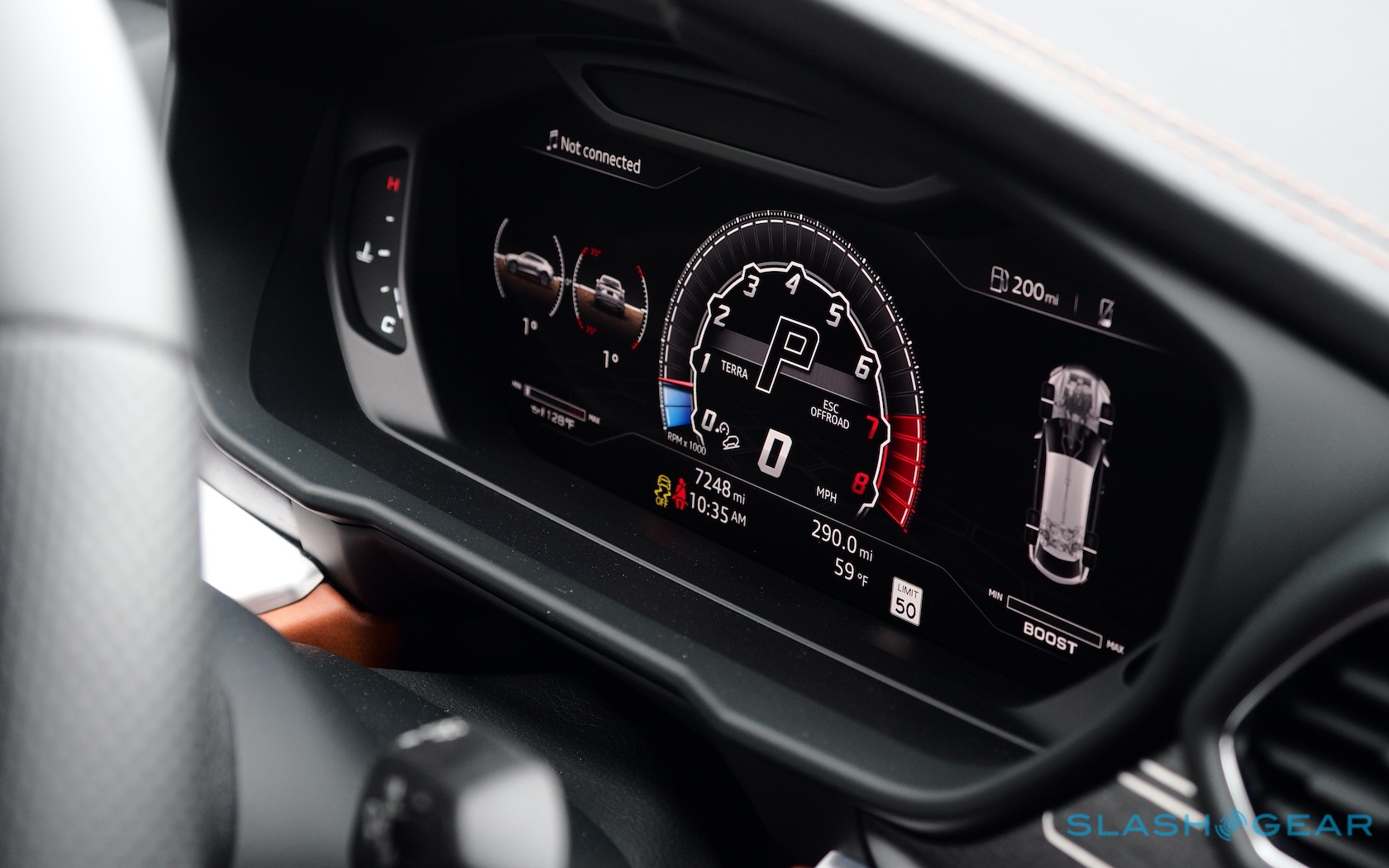That goes for the virtual cockpit-esque digital instrumentation, and the steering wheel buttons which are what you could expect to find in an Audi A4. Clearly Lamborghini spent more time on the paddle shifters, which are oversized slices of machined metal that could each double as a Batarang. Weirdest flourish of all is the cluster of transmission and drive mode controls, as though the levers from some luxury yacht have been repurposed as a robot's codpiece.